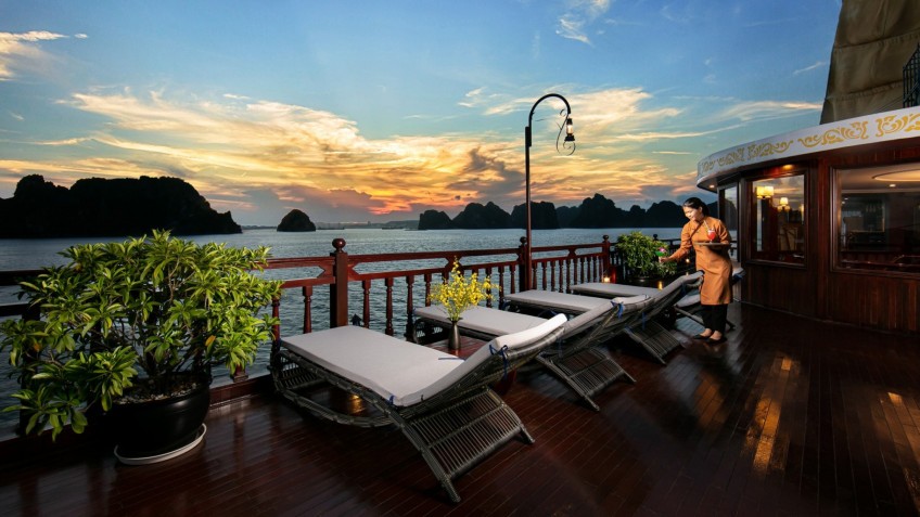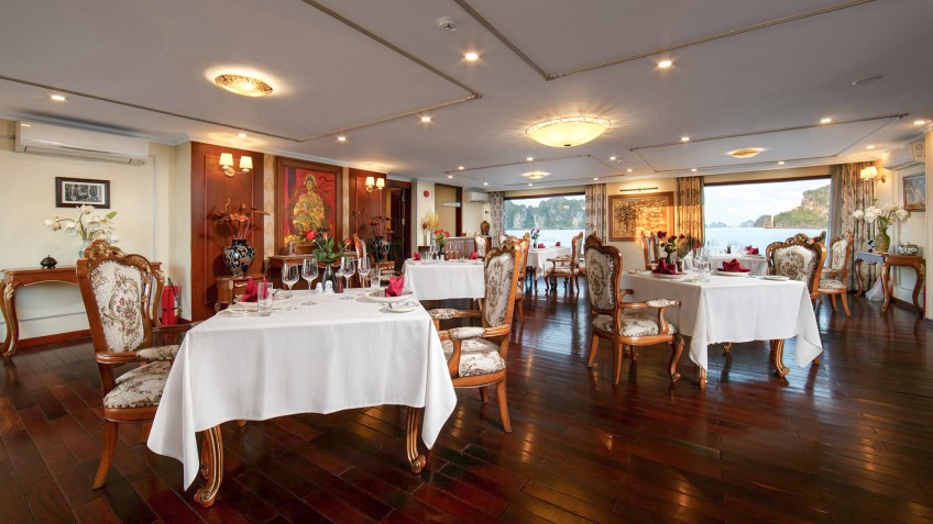 Located on the top deck to give guests fresh air, this lounge & bar offer both indoor and outdoor dining space with a 360-degree Halong Bay view. It can be arranged to serve breakfast, and dinner upon request, as well as the sunset party, afternoon tea, cooking class, and wine tasting.