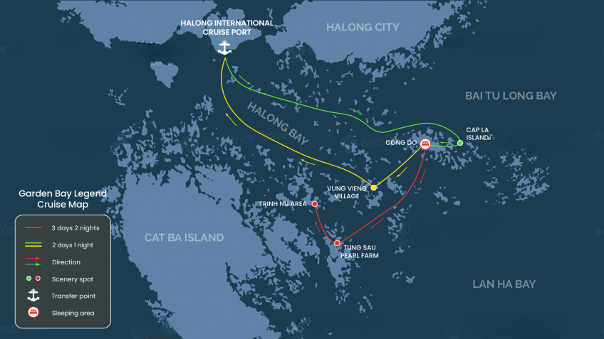 Suppose you are traveling independently from Hanoi to Halong Bay. You must arrive before 11:00 to board the Garden Bay Legend Cruise small boat at the International Marina in Halong, Quang Ninh. You can also meet your tour guide and the cruise team before the ship departs for Bai Tu Long Bay.