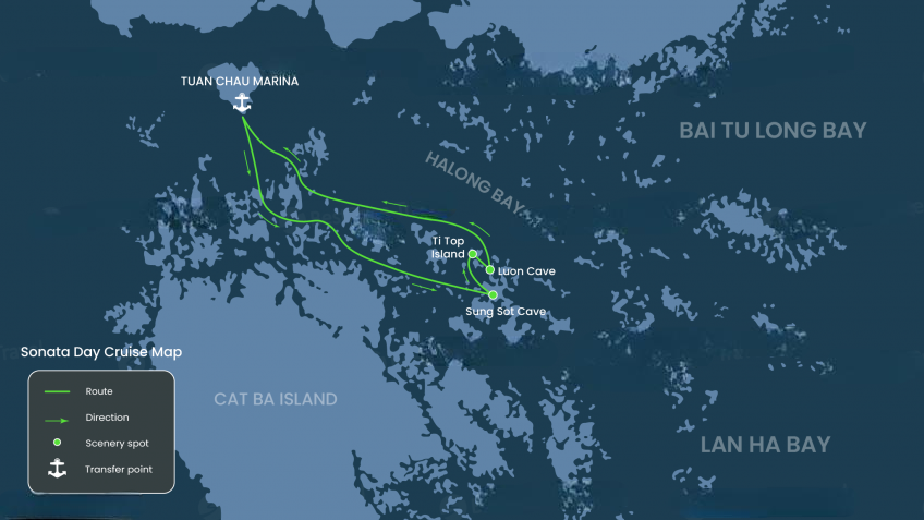 You will arrive at the Sonata Waiting Lounge at Pier No. 21 in Tuan Chau Marina around 12:00 - 12:15. Let's check in, then board the Sonata Cruise, and begin your enchanting 5.5 to 6-hour journey through the scenic Halong Bay.