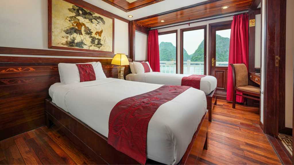 This traditional wooden junk boat is designed in Indochinese style, showing clearly through the pearl white of the ship’s exterior, the burnished brown of its handrails, and the exquisite wall art. Most of the interior on board is built of aromatic wood, which is highly durable with beautiful grain, contributing to the boat's vintage character.