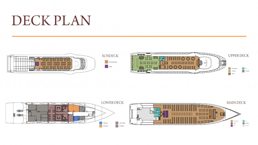 - The lower deck includes a medical area and a kid club, along with a staff area and storage.