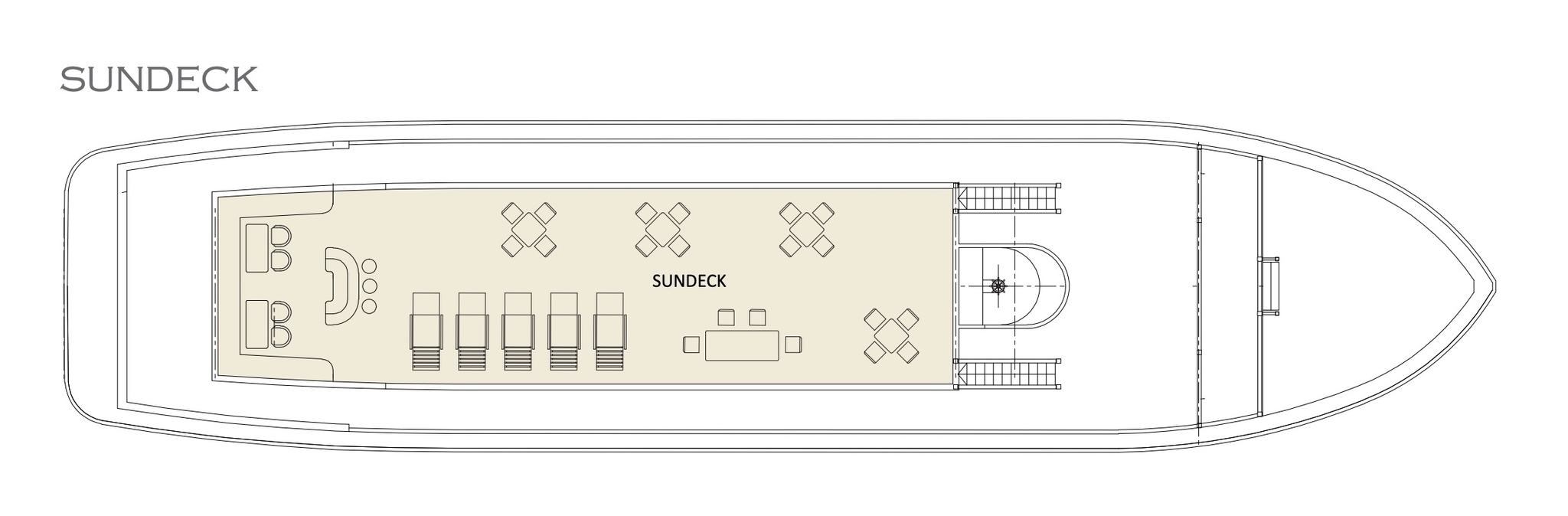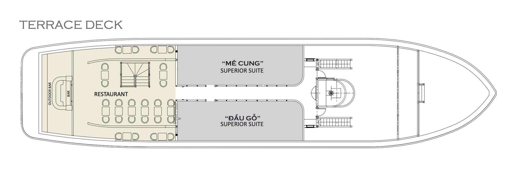 The Upper Deck is where 02 Superior Suites (40m2, private balcony) and 02 Premium Suites (42m2, private terrace) are located. The stern of this boat is the space for the kitchen.
