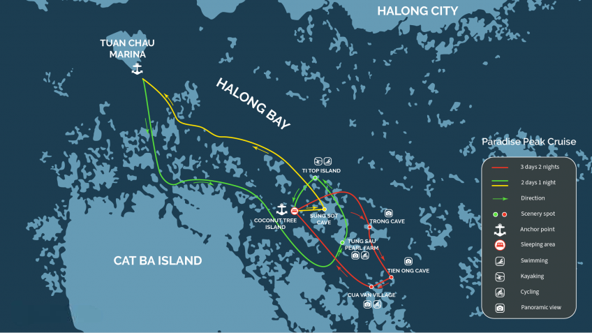 - The cruise is highly praised for its comprehensive itineraries that encompass the most remarkable destinations in Halong Bay: Titop Island, Sung Sot Cave, and more.