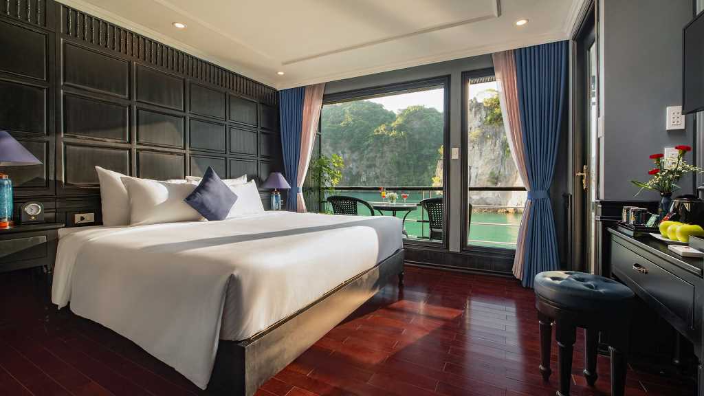 As one of the best cruises in Halong Bay, Rosy Cruise Halong Bay promises to provide a comfortable overnight stay for a variety of customers, with 22 cabins outfitted with modern interiors, bathtubs, and private balconies. This cruise ship also offers high-class amenities such as a breezy jacuzzi, a spa, and outstanding service with a focus on giving superb hospitality.