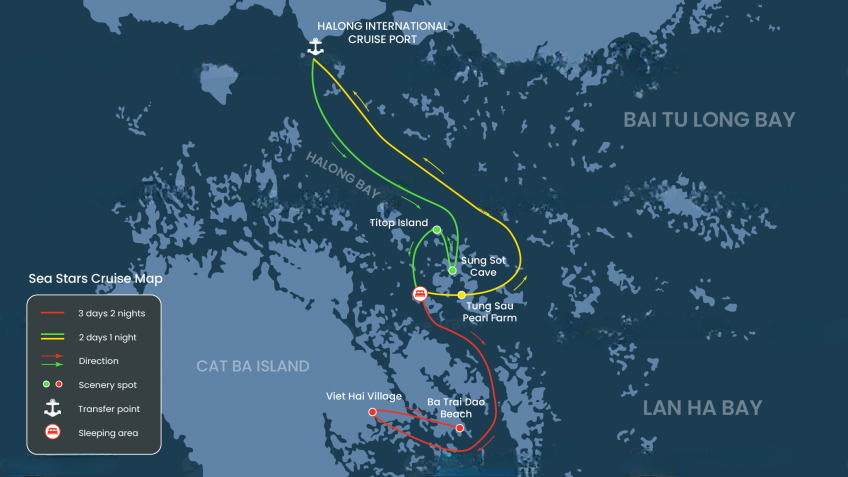 During the 2-day-1-night cruise, passengers will follow a well-structured itinerary to explore the wonders of Ha Long Bay. This includes visiting popular destinations such as Surprise Cave, Titop Island, and Tung Sau Pearl Farm. For those opting for the 3-day trip, the journey includes additional attractions like Viet Hai Village, Tai Queo Cave, and Ba Trai Dao.