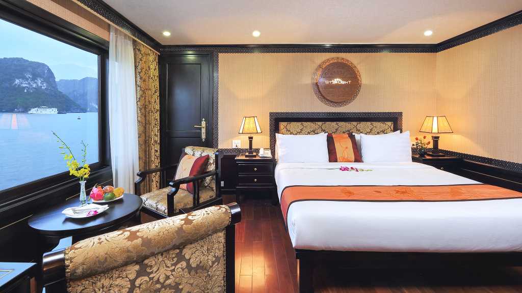 Indulge in spacious bedrooms, boat restaurants, stylish bars, plus leisure options like a jacuzzi, massages, and even a mini-golf course. A beacon of light for local fishermen at night, the modern design of Starlight Cruise extends to cabins, restaurants, sundecks, bars, and a gym, promising cherished memories for your Halong Bay journey.