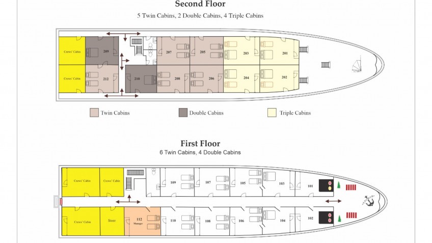 The first two decks are dedicated to accommodation. The 1st deck houses 10 Deluxe Ocean-view Suites, including 6 Twin and 4 Double cabins.