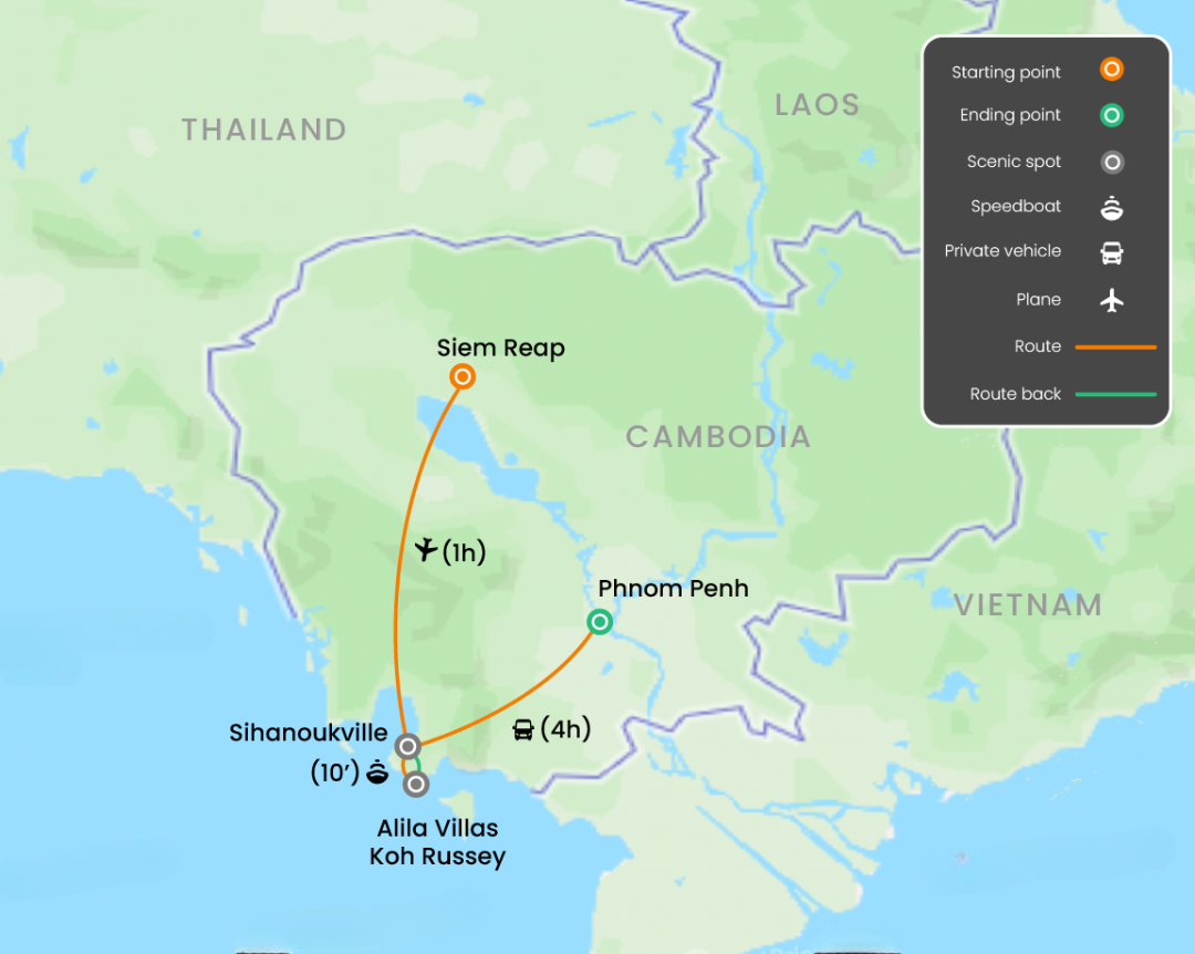 - Accommodation 4 nights in Siem Reap, 3 nights in Koh Russey Island, and 2 nights in Phnom Penh.