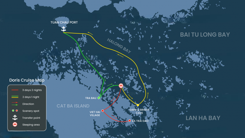 The 2-day tour of Doris Cruise brings you to Tra Bau and Dark & Bright Cave while the 3-day tour adds an extra day for you to explore Viet Hai Village and Ba Trai Dao Beach. The schedule always strives to provide many exciting activities onboard and offboard as below.