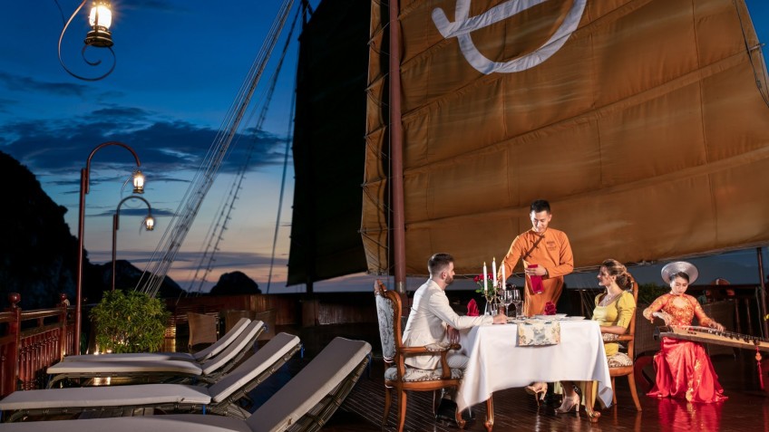 Located on the top deck to give guests fresh air, this lounge & bar offer both indoor and outdoor dining space with a 360-degree Halong Bay view. It can be arranged to serve breakfast, and dinner upon request, as well as the sunset party, afternoon tea, cooking class, and wine tasting.