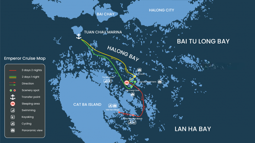 Compared to other cruises, Emperor has quite an interesting itinerary of must-visit spots in Halong and Lan Ha Bay, including Me Cung Cave, Luon Cave, Ba Trai Dao Beach, and Viet Hai Village. In addition, the cruise also provides a unique and energetic activity onboard, which is practicing Vovinam, a traditional Vietnamese martial art in the morning.