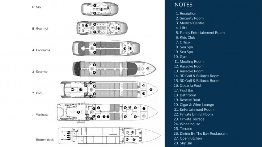 The bottom deck has 02 karaoke rooms and a Cinema room. The 1st (Serenity), 5th (Gastronomy) & 6th (Majestic) floors have the same layout as Grand I, except for a new gift shop on the 1st floor.