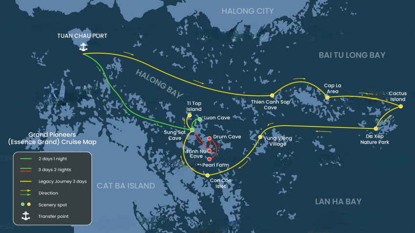 On May 21, 2024, Essence Grand Cruise officially changed its name to Grand Pioneers Cruise, using a new brand development approach, positioning themselves as the pioneers of the "Legacy Journey." Amidst the magnificent wonders of nature in Halong Bay & Bai Tu Long Bay, this high-class cruise will lead the voyage along the national coast and extend further around the world.