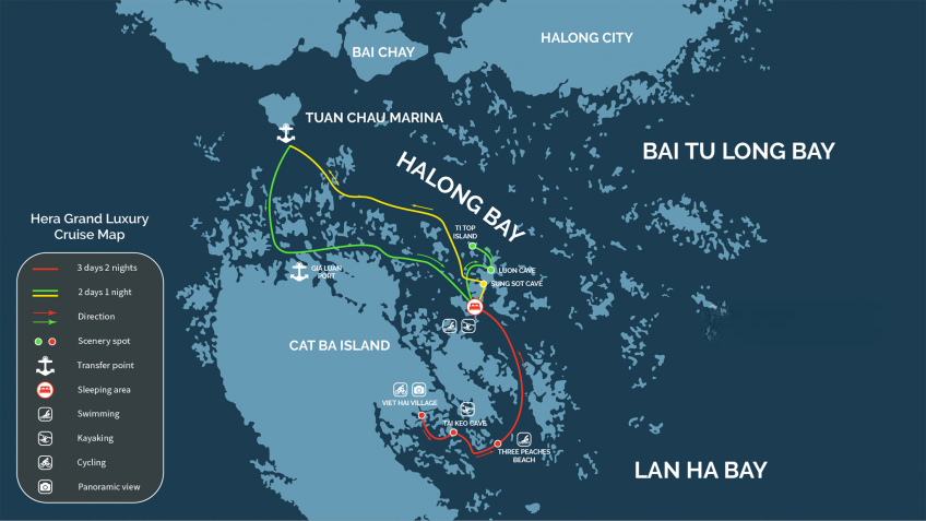 Cruising on Hera Grand Cruise, you visit the famous Luon Cave, Titop Island, and Sung Sot Cave for the 2D1N tour. The 3D2N brings you to Lan Ha Bay to visit Dark & Bright Cave, Ba Trai Dao, and back to Pearl Farm in Halong Bay on an extra day.