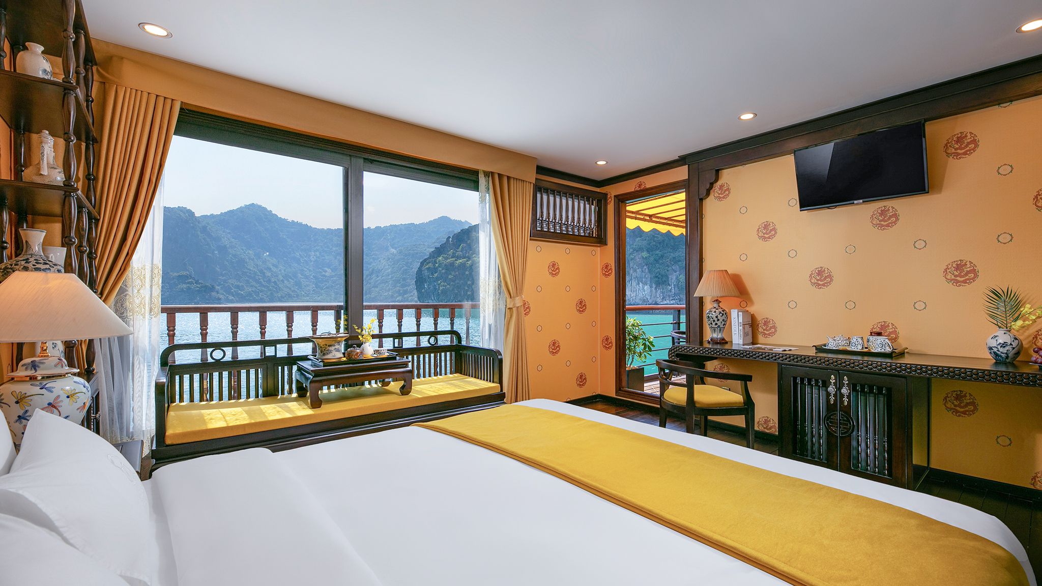- Various traditional activities onboard: wearing Vietnamese costumes at dinner, joining tea ceremony