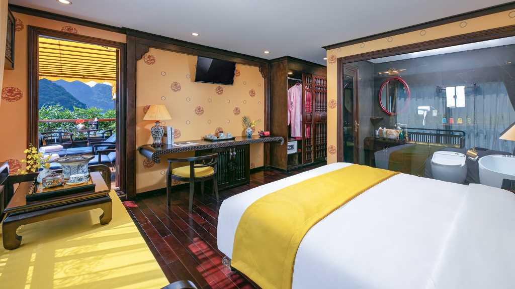 This cruise has 2 boats with 10 private cabins each divided into 3 standards: King, Queen, and Princess Suite. Except for the King Suite, all the Queen and Princess Suites have connecting doors to create Family Connecting rooms to suit customers' requirements. Also, each cabin has its own private balcony to create a comfort zone and satisfy the need for sightseeing in Halong Bay.