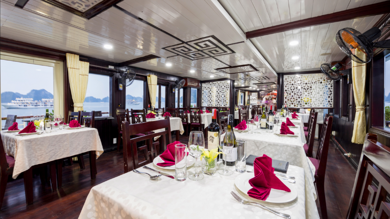 Getting on the cruise, travelers will receive welcome drinks, daily 02 bottles of water in the room, and daily fresh fruits in the restaurant. In addition, extra drinks are available in the bar. Stretch your budget a little more, you can also have teas, coffees, fresh juices, mocktails, cocktails, wine, and spirit lists sourced from around the world.