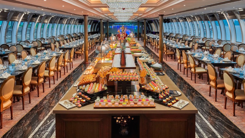 The day-cruise restaurant promises the most sumptuous buffet (main deck) and à la carte (upper deck) menu from Asian and Western cuisine, an appealing drink list, and a variety of entertaining activities. Diners have a chance to enjoy live music, dancing, cocktails, or violin/piano performances.