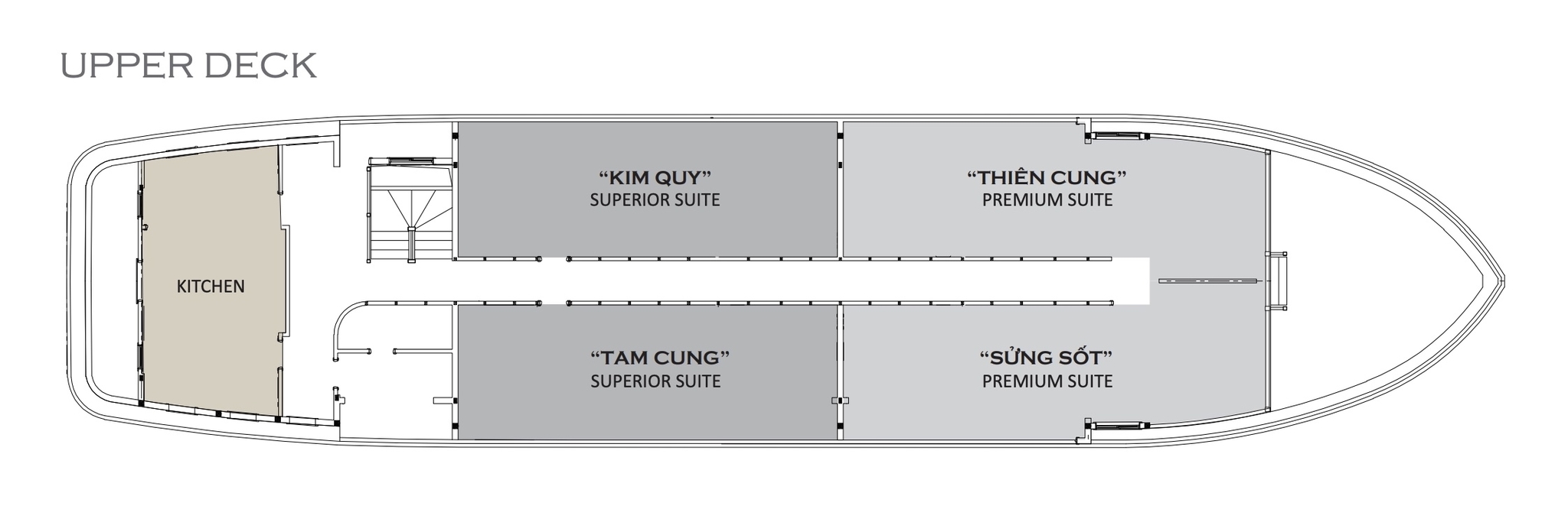 The Upper Deck is where 02 Superior Suites (40m2, private balcony) and 02 Premium Suites (42m2, private terrace) are located. The stern of this boat is the space for the kitchen.