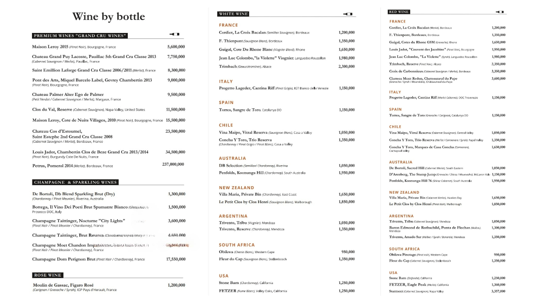 - Alcohol: From US $39/ bottle & US $8/ shot