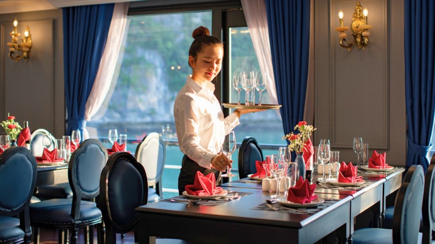 Rosy Cruise Halong Bay offers a great dining experience that is suitable for all types of guests. The meals offer various Western, and Asian dishes and seafood options. In addition, the cruise also provides special menus for vegetarians, diets, or food allergies.