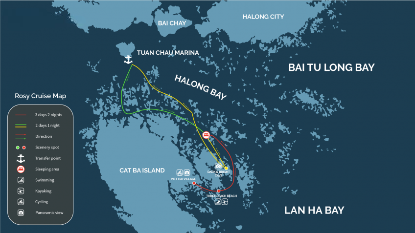 On Rosy Cruise Halong Bay, the 2-day-1-night cruise will take tourists to the stunning Lan Ha Bay attractions such as Tra Bau and the Dark & Bright Caves. For the 3-day-2-night, the schedule is extended for 1 day which will be spent in Viet Hai Village & Ba Trai Dao.