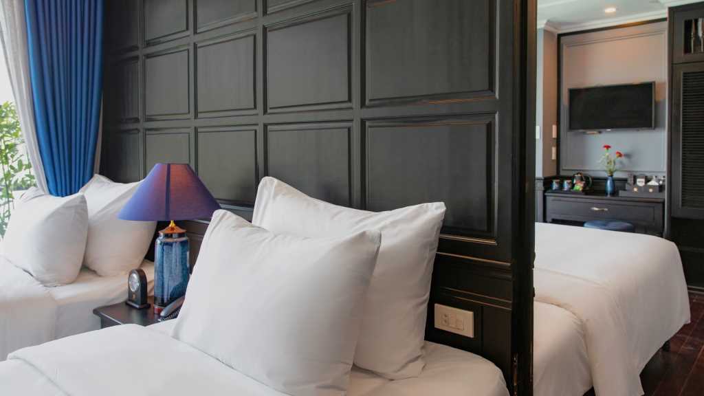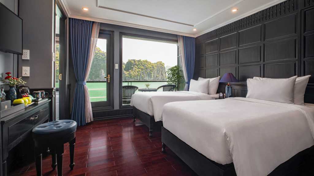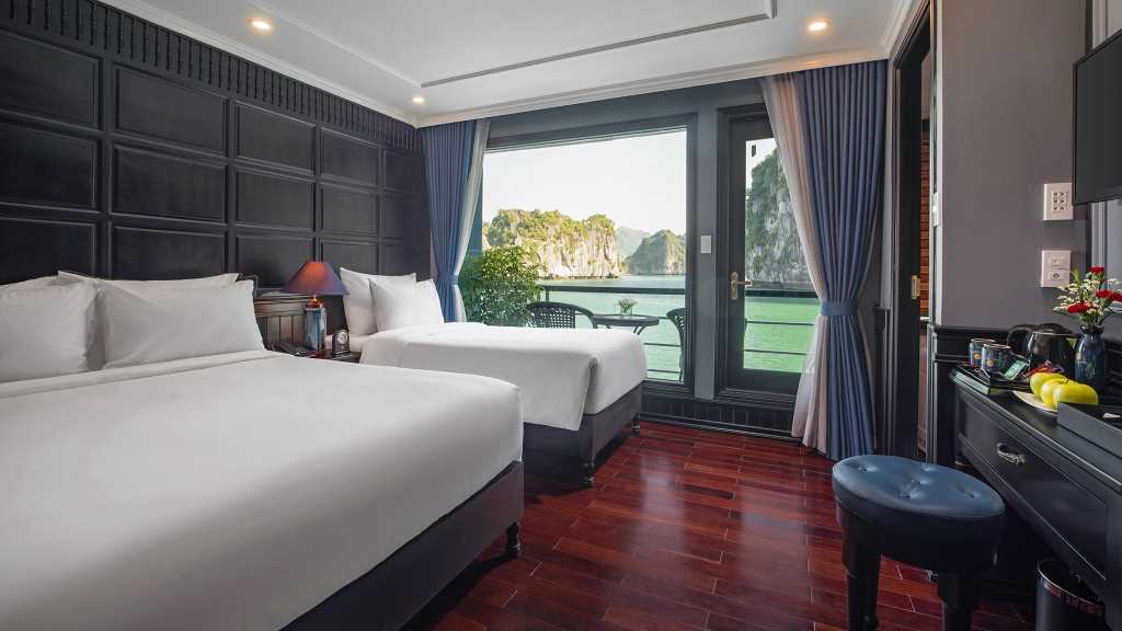 As one of the best cruises in Halong Bay, Rosy Cruise Halong Bay promises to provide a comfortable overnight stay for a variety of customers, with 22 cabins outfitted with modern interiors, bathtubs, and private balconies. This cruise ship also offers high-class amenities such as a breezy jacuzzi, a spa, and outstanding service with a focus on giving superb hospitality.