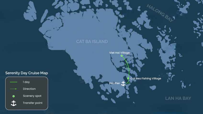 Please be on time at Halong Serenity Cruises office (No.191, Road 1/4, Cat Ba Town) or be ready at your hotel in Cat Ba Town around 8:15 - 8:45. The Cat Ba Express bus will pick you up to transport to Beo Pier.