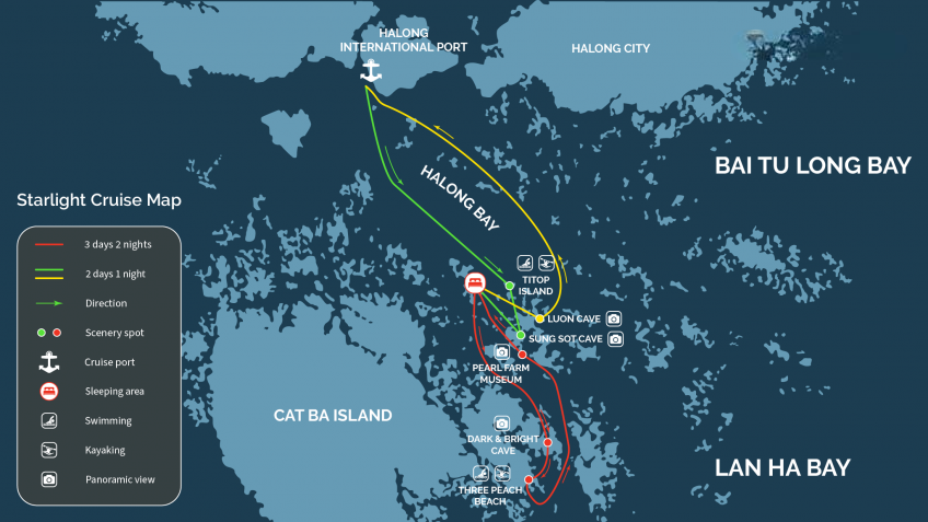 Starting your voyage on Starlight Cruise at Hon Gai Port, you will sail through Halong Bay while tasting your first lunch. In the 2-day itinerary, the Starlight Cruise brings you to travel to Vung Vieng Village, Cong Do Area, and Thien Canh Son Cave. The 3-day itinerary has the same route on day 1 and day 3. Expanding more on day 2, you can pad a kayak around Tra San, and Vung Ha Island.