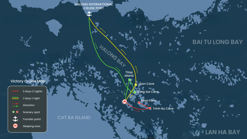 Victory Cruise boat Halong Bay's 2-day itinerary primarily explores the iconic attractions including Luon Cave, Sung Sot Cave, and Titop Island. The 3-day itinerary extends further into secluded spots and the serene Lan Ha Bay, offering a more tranquil experience with stops at Trinh Nu Cave, Pearl Farm, and Ba Trai Dao Beach.