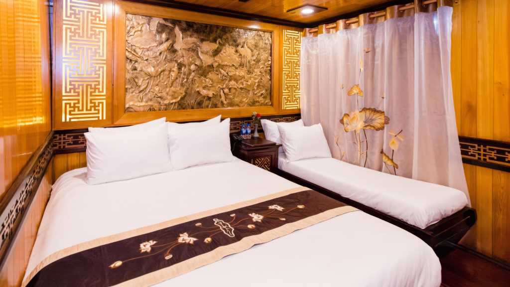 As you sail through the bay, this junk boat invites guests to explore iconic landmarks and engage in a variety of exciting outdoor activities to explore the beauty spots in Halong Bay and Lan Ha Bay.