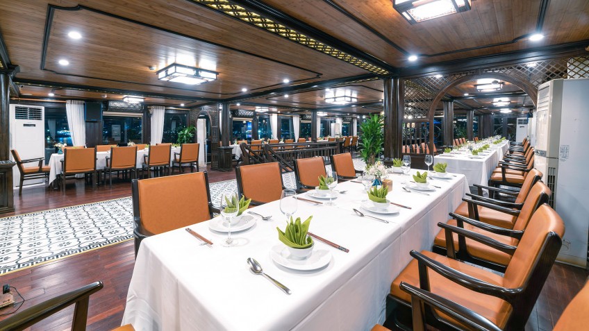 The spacious dining area, located on the 3rd deck and decorated in traditional style, offers a beautiful bay view and a comfortable dining experience for guests. Furthermore, the restaurant has a projector, allowing the cruise to prepare events upon request.