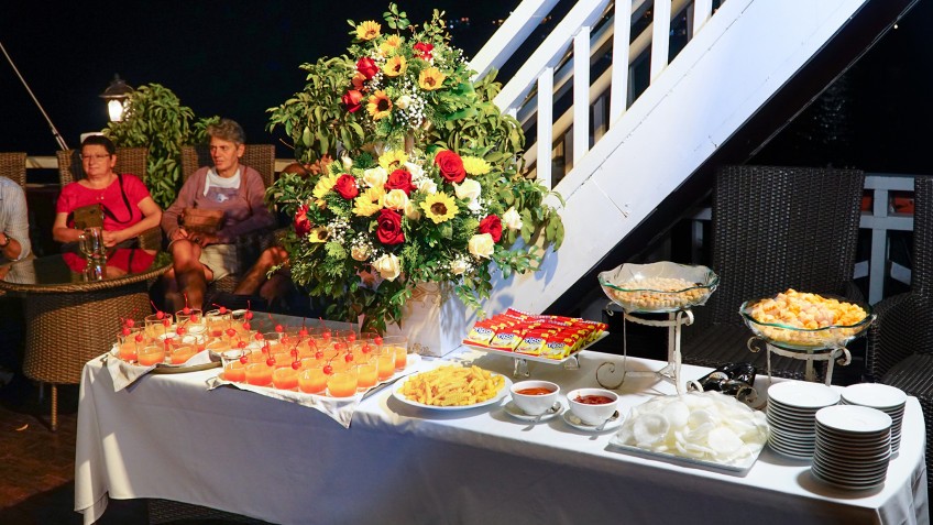 The meals on this junk boat include buffets for breakfasts and brunches and set menus for lunches and dinners. The buffets will provide you with various international and seafood dishes, while the menus emphasize authentic Vietnamese cuisine more.