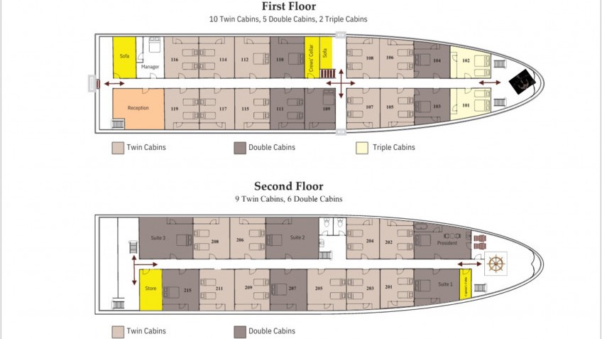 The 2nd deck has 11 remaining Deluxe cabins, 03 Suites (28m2), and 01 President Suite (34m2), all equipped with private balconies.