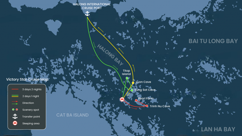 On Victory Star Cruise Halong Bay, the 2d1 ntour will take you to famous attractions of Halong Bay: Luon Cave, Titop Island, and Sung Sot Cave. With the 3d2n itinerary, you will have an extra day to explore Trinh Nu Cave, Pearl Farm, and further in Lan Ha Bay Ba Trai Dao.