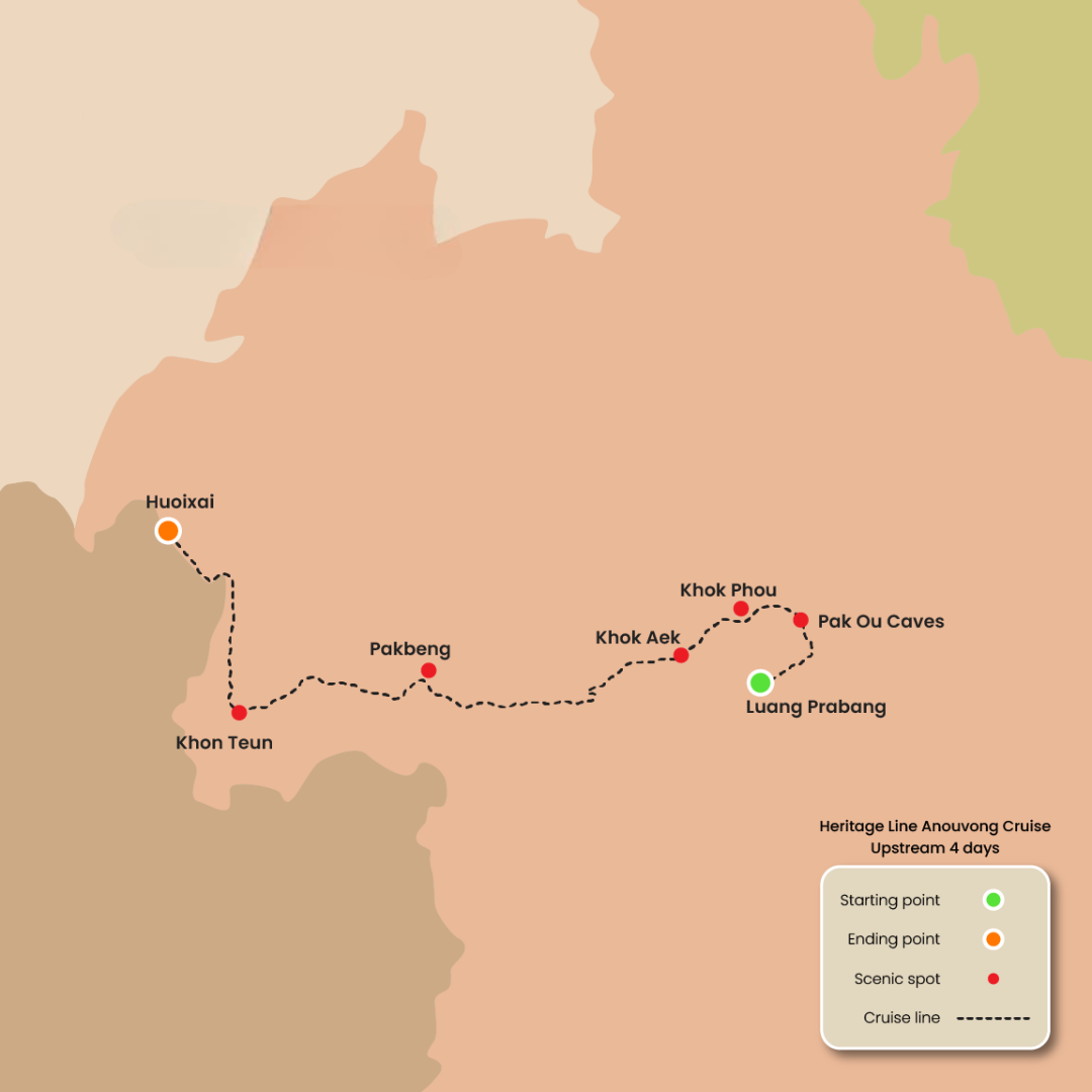 The Heritage Line Anouvong Cruise offers 04 primary routes. The two 4-day itineraries take you on an up/downstream journey between Luang Prabang and Huay Xai, while the Huay Xai - Vientiane route offers an 8-day downstream and a 10-day upstream itinerary.