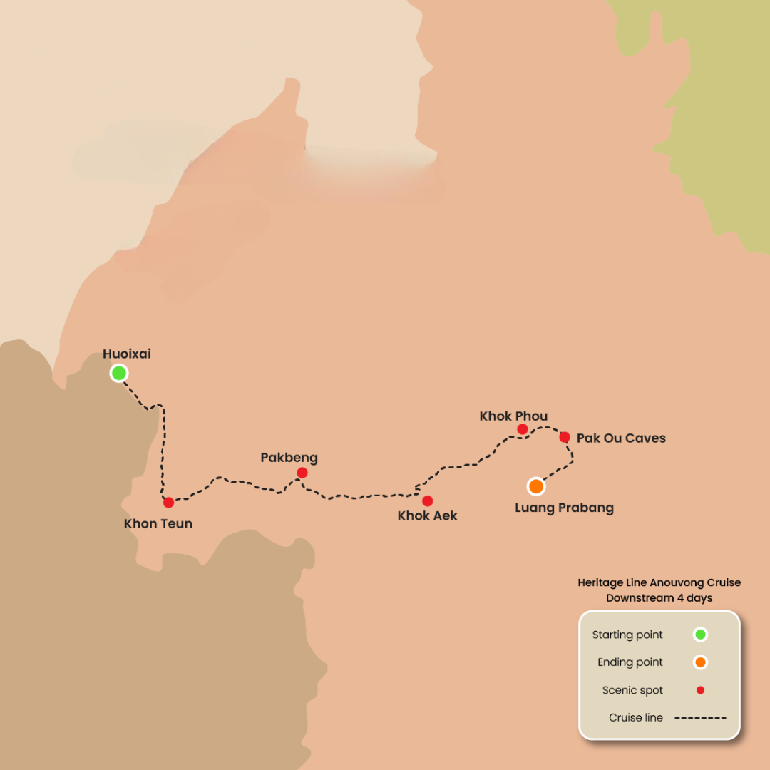 The Heritage Line Anouvong Cruise offers 04 primary routes. The two 4-day itineraries take you on an up/downstream journey between Luang Prabang and Huay Xai, while the Huay Xai - Vientiane route offers an 8-day downstream and a 10-day upstream itinerary.