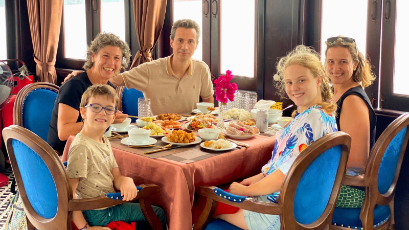 Lunch is served on the boat while cruising leisurely through the spectacular scenery of Halong Bay.